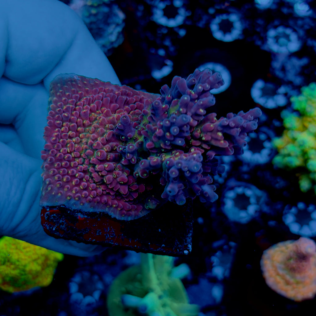 Dark, dangerous, and dripping in attitude — JF Frankie’s Neophobia is a moody masterpiece from the twisted mind of Jason Fox. This Acropora is a heavy-hitter in the deepwater scene, flaunting burgundy to maroon base tones, indigo blue tips, and golden-yellow polyp mouths that look like they’re staring straight into your soul.